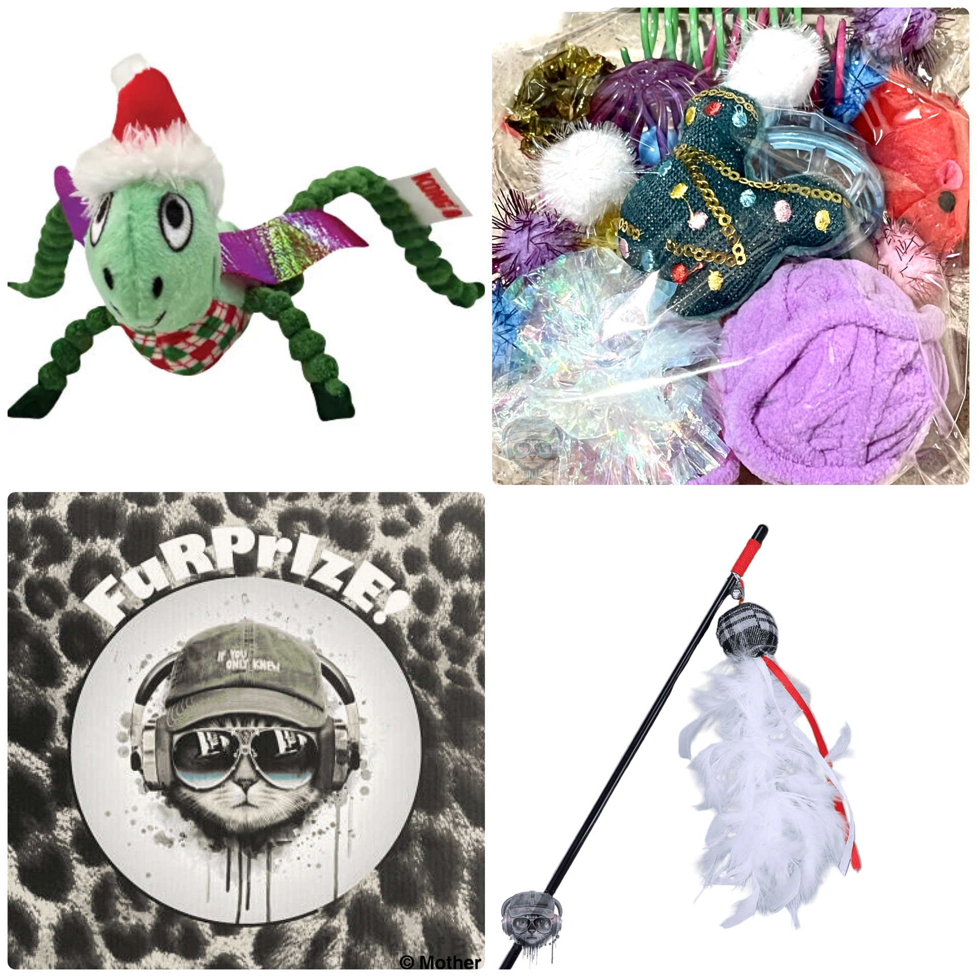 Free Kong Holiday Grasshopper, Furprize Holiday cat nip toys , Festive Wand, & FREE Furprize gift box